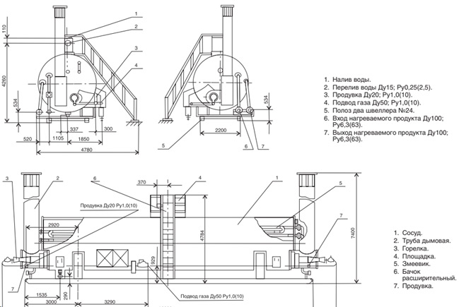 Снаружи сосуда смонтированы узлы подготовки и подачи топлива горелочным устройствам, указатель уровня теплоносителя, лестница, площадка обслуживания.